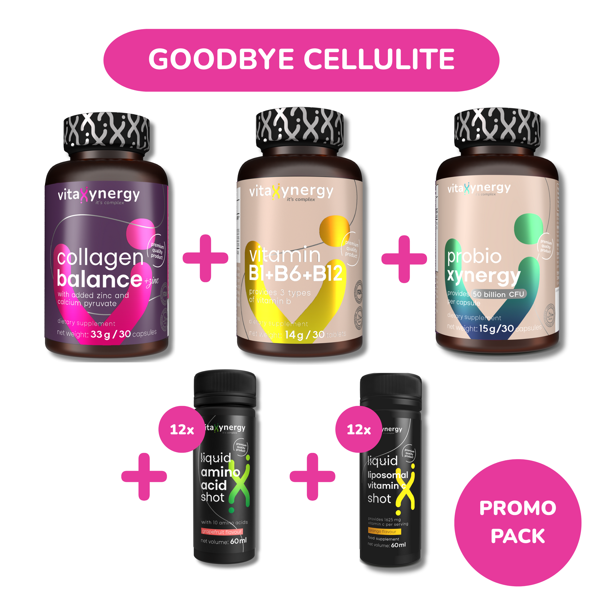 Spune „Adio” celulitei cu un pachet complet gândit pentru frumusețe din interior! Collagen Balance susține elasticitatea pielii, Vitamina C lipozomală lichidă contribuie la sinteza normală a colagenului, iar complexul de B-uri sprijină metabolismul energetic. Liquid Amino Acid Shot hrănește mușchii și țesuturile, iar ProbioXynergy ajută la o digestie optimă – pentru o piele sănătoasă, fermă și un corp echilibrat.