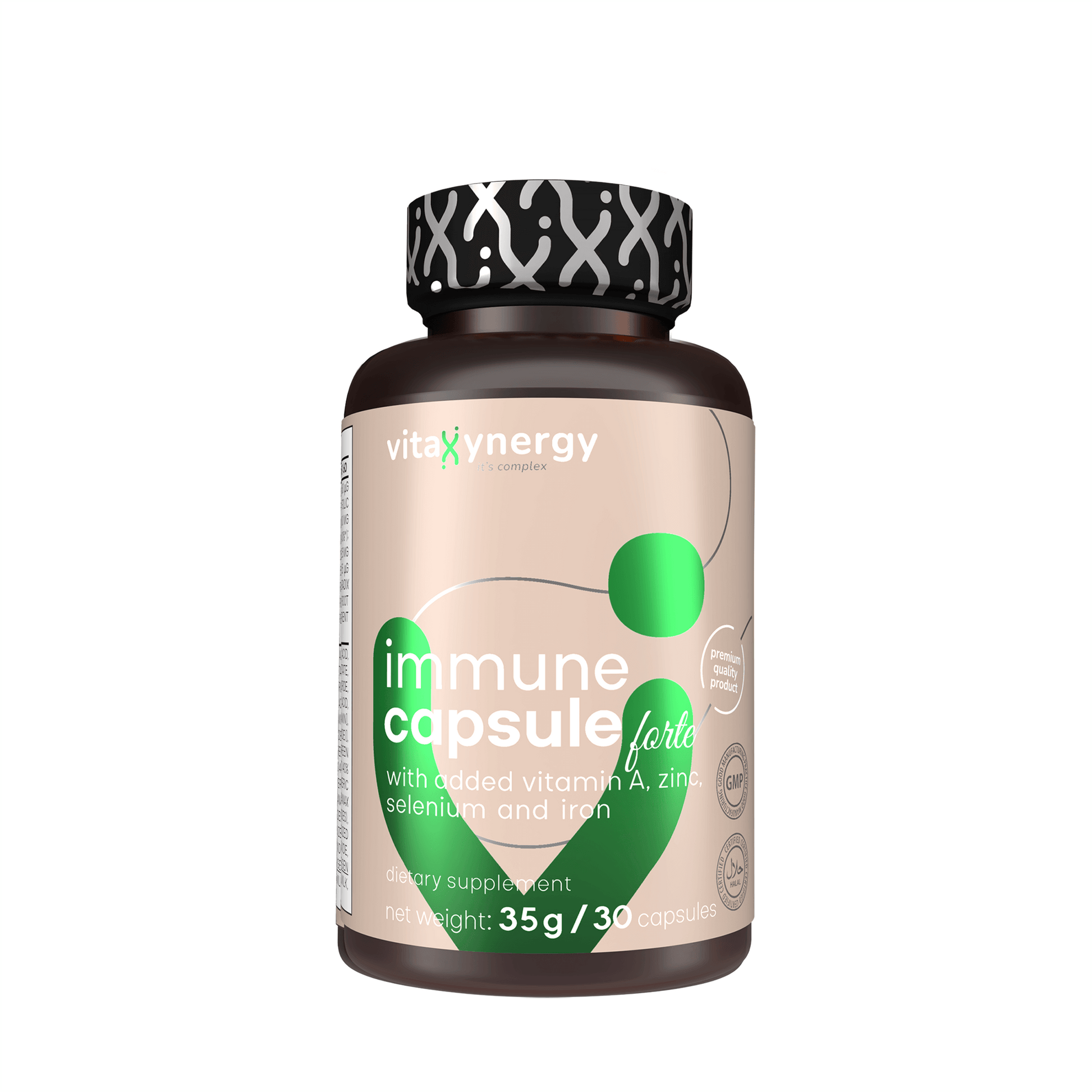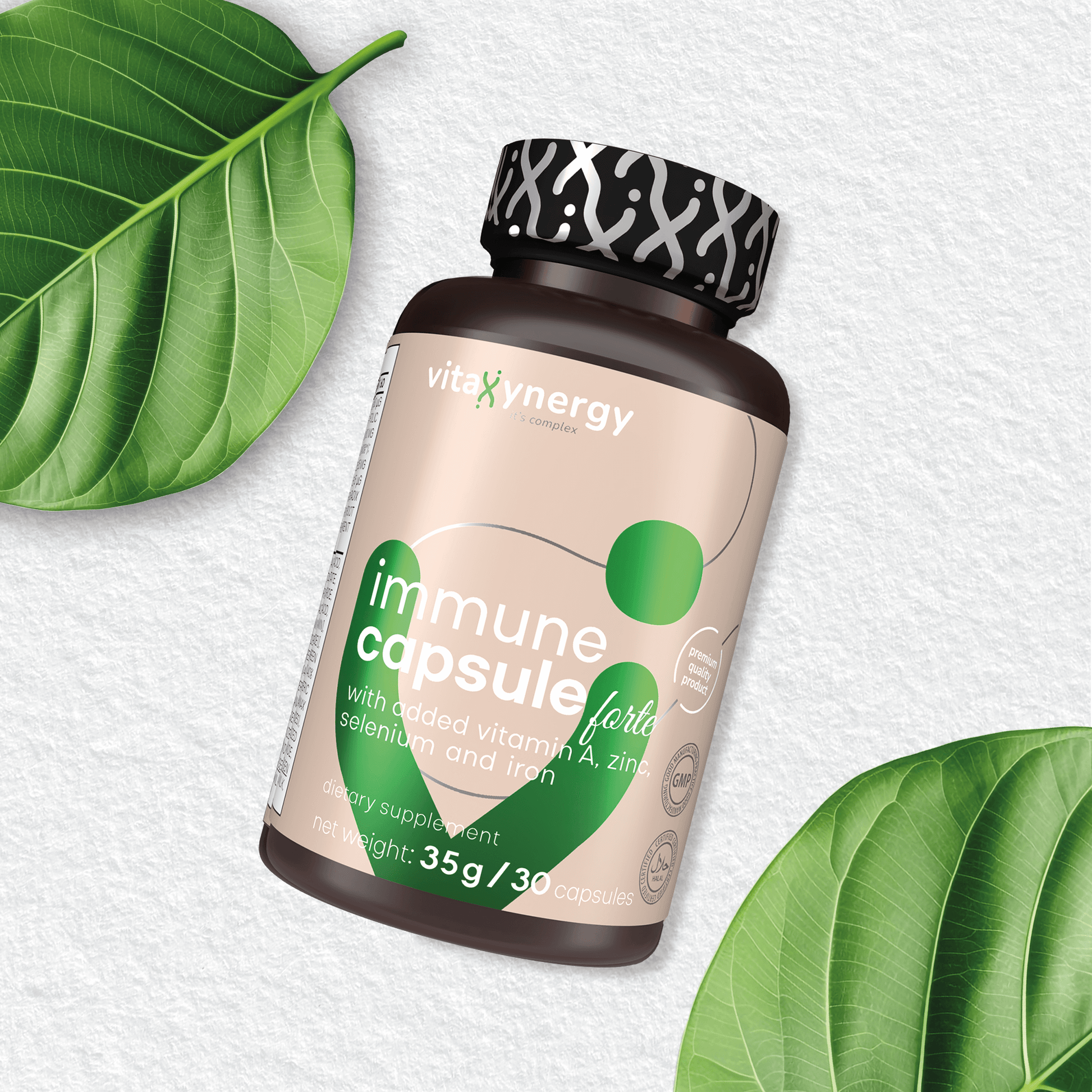 Informaţii despre supliment Porţie: 1 capsulă PORŢII PER FLACON: 30 Continutul unei portii (1 capsula) (NRV*): Vitamina A 860 µg (107%*); Vitamina B2 1,3 mg (92%*); Vitamina B6 1,3 mg (92%*); Acid folic 400 µg (200%*); Vitamina B12 2,4 µg (96%*); Vitamina C 500 mg (625%*); Vitamina D3 50 µg (1000%*); Vitamina E 25 mg (208%*); Fier 18 mg (128%*); Zinc 11 mg (110%*); Seleniu 55 µg (100%*); Extract de Cistus turcesc (Cistus incanus) 50 mg; Extract de Echinaceea (Echinaceae Radix Pulvis) 50 mg; Turmeric (pulbere din radacina turmeric (Curcuma longa) 50 mg of din care curcuma 1,5 mg. *Valorile nutritive de referință pentru un adult. Ingrediente: Acid L-ascorbic, învelişul capsulei (gelatină), maltodextrină, acetat de DL-alfa-tocoferil, fumarat feros, pulbere din radacina Echinaceea (Echinaceae Radix Pulvis),pulbere din radacina turmeric (cu conţinut de curcuma 3%) pudra de Cistus turcesc, agenţi antiaglomeranţi (dioxid de siliciu, săruri de calciu ale acidului ortofosforic), colecalciferol, oxid de zinc, acetat de renitil, cianocobalamină, clorhidrat de piridoxină, riboflavină, acid pteroilmonoglutamic, selenit de sodiu. |