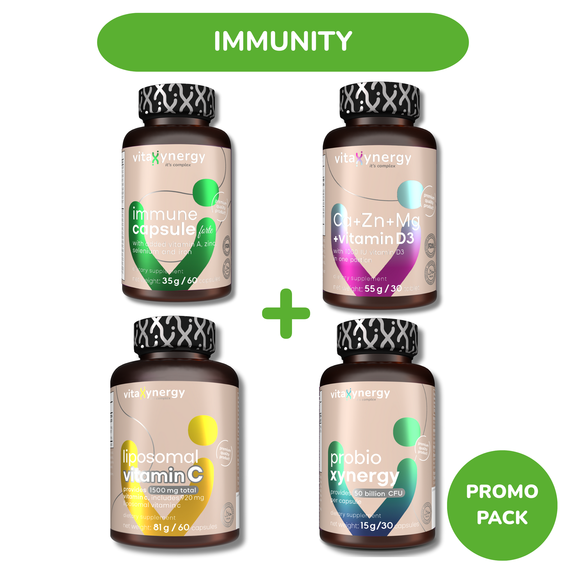 Întărește-ți sistemul imunitar cu un mix esențial de nutrienți! Pachetul Imunitate conține combinația perfectă pentru protecție zilnică: Immune Capsule Forte cu extracte naturale puternice, Vitamina C lipozomală pentru absorbție maximă, Ca+Zn+Mg+D3 pentru susținerea oaselor și a imunității, și ProbioXynergy pentru echilibrarea florei intestinale.