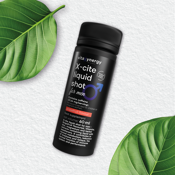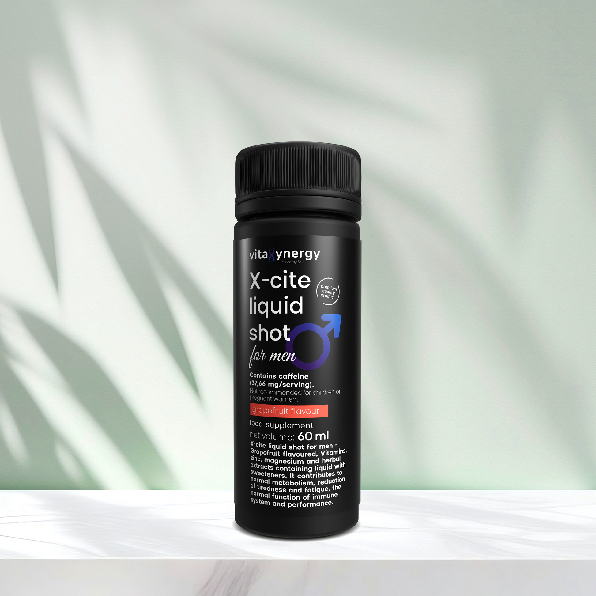X-Cite Liquid Shot for Men este un supliment alimentar lichid, cu aromă de grapefruit, conceput pentru a sprijini sănătatea sexuală, performanța și vitalitatea bărbaților. Formulat cu vitamine esențiale, minerale, aminoacizi și extracte din plante puternice, precum guarana, ceai verde, yam sălbatic, lucernă, ginseng siberian, tribulus terrestris, ginseng panax, nucă kola și maca, acest shot este destinat să îmbunătățească libidoul, să crească rezistența și să susțină echilibrul hormonal. Fiecare shot de 60 ml oferă nutrienți țintiți care acționează sinergic pentru a sprijini în mod natural performanța sexuală, anduranța și nivelul de energie.